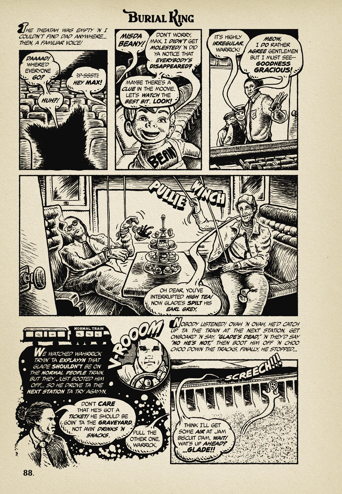 Faites la connaissance de Max, un chaton aux os frémissants qui se lie d’amitié avec un squelette maléfique dans le hall du cinéma. Découvrez Kennedy, jeune fille de la campagne à la chevelure couleur maïs devenue directrice de théâtre sophistiquée, dissimulant sa langue mielleuse à ses collègues. Et voici Warrick, l’acteur tragique du film de midi, lancé à la poursuite du cadavre volé de son frère décédé.